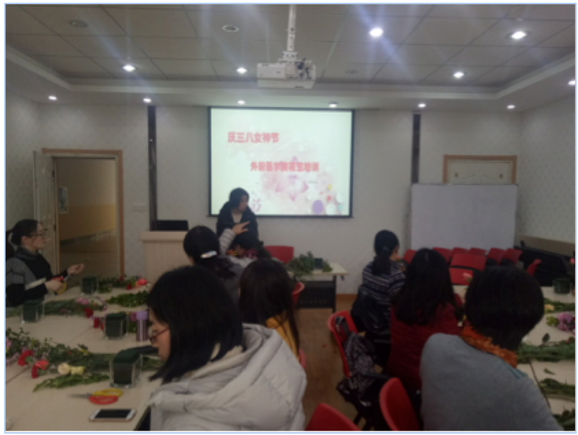 在花艺培训师的指导,参加活动的女教工开始精选花材,精心修剪,细心布局,相互之间还不时进行交流,在遇到问题时虚心向培训师请教。