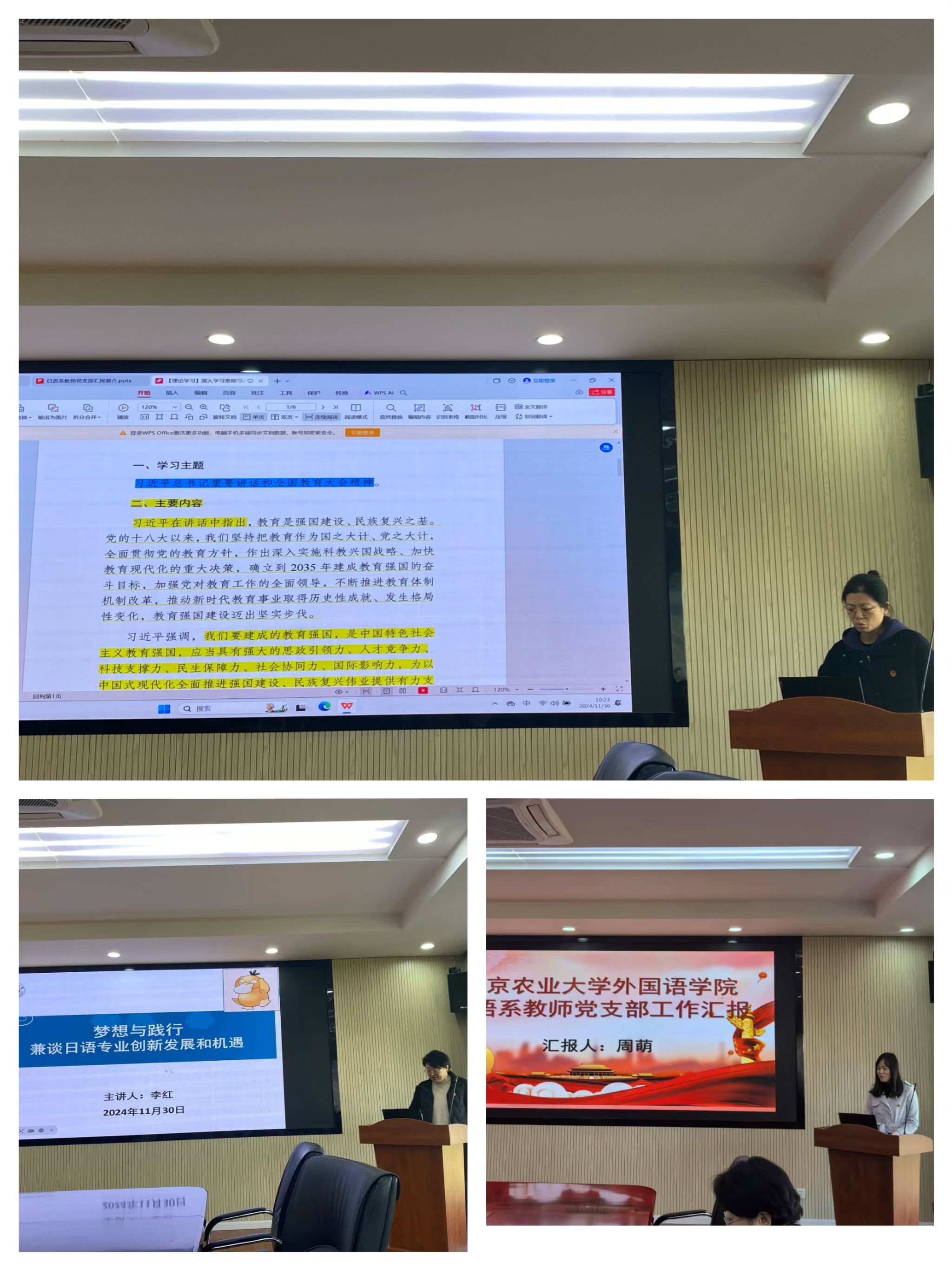 在集中学习环节,安徽农大王川老师领学了习近平在中共中央政治局第十七次集体学习时的重要讲话精神,强调了锚定建成文化强国战略目标、不断发展习近平新时代中国特色社会主义思想的重要性。澳门正规官网日语系教师党支部副书记曹娟领学了全国教育大会精神和《关于弘扬教育家精神加强新时代高素质专业化教师队伍建设的意见》,引导大家深入理解新时代教育工作的新要求和新任务。