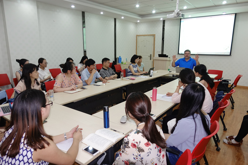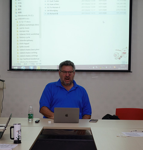 第一场讲座的题目是 "All the World’s aStage": An American Actor andDirector in China(“世界是个舞台”我为什么会成为莎士比亚戏剧演员与导演)。Irwin教授与大家分享了自己的戏剧人生故事。他从16岁开始学习表演,后来成为演员、导演、莎士比亚戏剧(以下简称莎剧)表演教授,给更多的年轻人传递对莎剧的热爱。