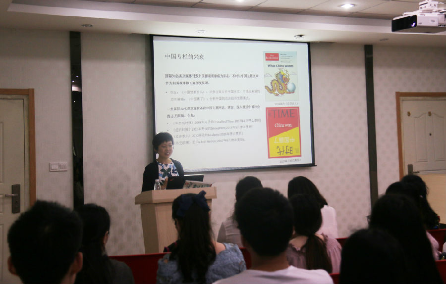 储丹丹首先讲述了历史上的“中国热”,指出不同历史阶段下,外国人所著有关中国的书籍也不尽相同。接着,她分析了中国人向欧美人“讲中国故事”的困难处境,并引用中国图书在欧美市场的占比进行例证。她列举出近年来外国人爱看的中国题材图书类型,分析了中国引进外国图书的种类特征。随后,储主编通过对不同种类图书的比较,指出大众图书选题离不开对网络热点的分析和运用,也揭示了中国图书成功输出所需的三个主要因素。讲座结束后,韩书记做出了简要总结,并对学生为讲好中国故事贡献力量寄予殷切的希望。