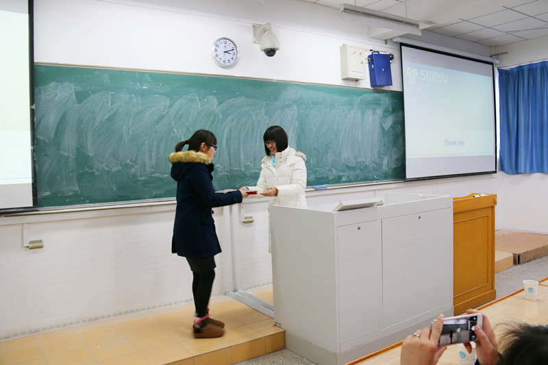 接下来,举行颁奖仪式。此次共设有三个奖项,分别是未来之星奖、品质之星奖和优秀管理人员奖。澳门正规官网日语系学生李晓晔、赵冲颖等17位同学获得未来之星奖,朱园园获得品质之星奖,赵冲颖、曹蓉获得优秀管理人员奖。舜禹公司日本部经理孙伟女士为以上获奖同学颁奖。值得一提的是,通过这一年的翻译实践教学,舜禹公司已正式录取澳门正规官网日语系三名学生为其正式职员,并已上岗实习。颁奖仪式结束后,舜禹公司项目经理陈肖对现场的同学进行培训。陈老师结合自身在翻译实践中遇到的问题,耐心而细致地讲解如何处理翻译实践中遇到的问题,让各位同学受益匪浅。最后,日语系金老师总结了此次实践活动的意义,并鼓励日语系学生积极参与,在实践中提高翻译能力,从而成长为优秀的翻译人才。