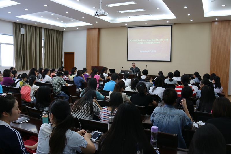 9月29日下午2点,Hart教授在教学楼7楼报告厅作了题为“The Art of Comparative Studies”的精彩讲座。Hart教授从其自身与中国城市的渊源入手,谈论了对比研究的积极意义。接着他深入简出地介绍了欧洲扩张与英语发展的历史。他以《哈姆雷特》一剧为例,阐释了从历史、地理、国别等角度进行比较分析的可能性。Hart教授分析了文学与历史的矛盾关系,认为莎翁历史剧取材于历史而又重饰历史。Hart和在座师生交流了对文学作品的理解,语言的发展趋势等问题。