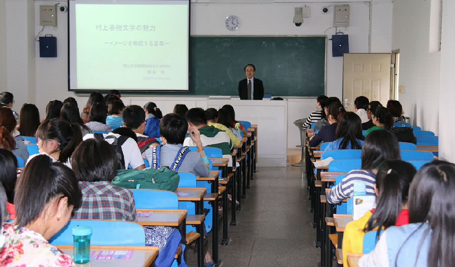 细谷博教授学术讲座的主题是“村上春树文学的魅力”。他首先给大家介绍了村上春树的新书《没有色彩的多崎作与他的巡礼之年》和最新短篇小说《没有女人的男人们》。细谷教授提出,日本文学翻译成中文进入中国后,总有一些地方会翻译得有些不尽人意,体现不出原作者所表达的精髓,进而影响读者的理解,难以产生应有的共鸣。细谷教授带领大家以日本人的视角来解读村上春树的作品,将能重点体现精髓或难以翻译出原文内涵的地方用不同的颜色标示出来,带着文中人物的心情,声情并茂地朗读了部分精彩段落,身形并茂,引领大家进入故事中主人公所在的那个世界,让大家对小说的理解更为深刻。