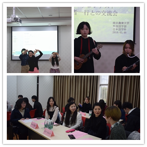 中日双方学生为此次交流会精心准备了节目。赵雨丝、范语馨同学用尤克里里和口风琴演绎了日文歌曲《Sunshine Girl》,仲安琪、乐伊凡同学为大家带来日本动漫《紫罗兰永恒花园》的日文配音表演。日方同学们也带来了《恋するフォーチュンクッキー》歌舞表演。表演结束后,双方学生进行了中日绕口令挑战、你划我猜游戏互动和分组主题讨论,现场气氛活跃友好。