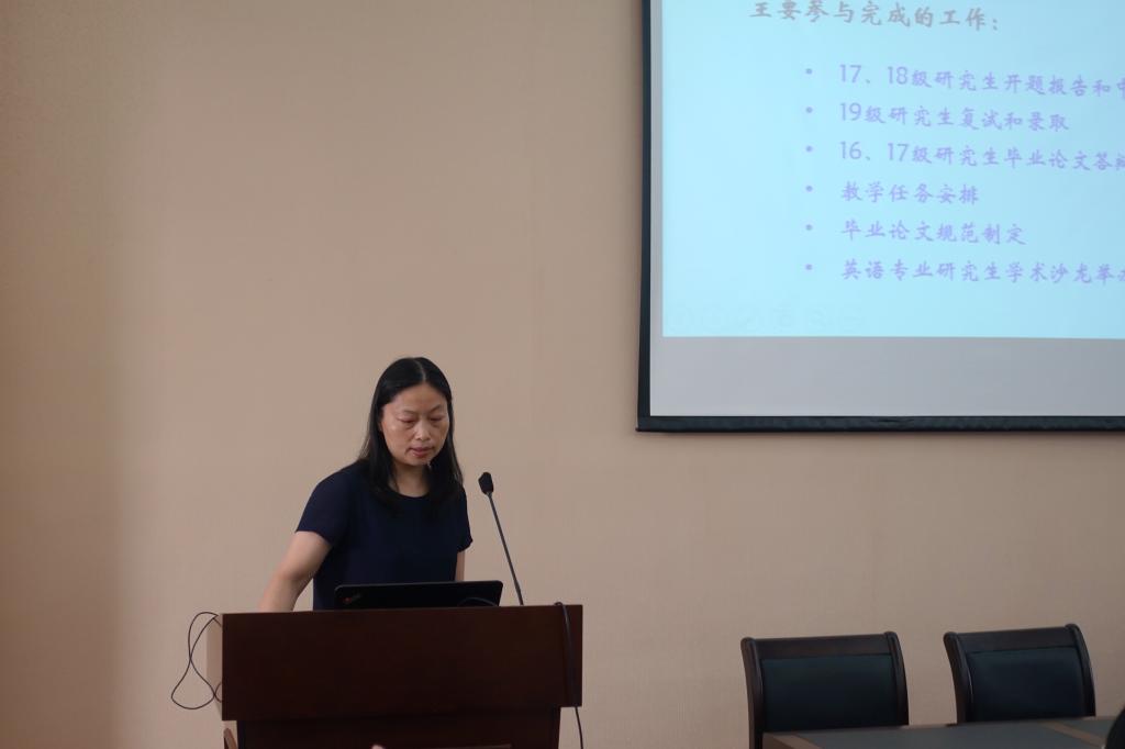 会议第二阶段由游衣明副院长主持。曹新宇副院长作了题为“关于外语教育和外语学科发展的哲理基础与路径探索的思考”的报告,石松书记作了题为“加强党建引领,推动学院发展”的专题报告。曹新宇在报告中,以工具理性和价值理性为哲理基础,以国家意识为关键词,以新农科建设的内涵分析为参照,就外语教育和外语学科的建设与发展提出了一系列的思考题。在“一带一路”建设、农业走出去、乡村振兴、生态文明建设的大背景下,外语专业如何凸显人才培养特色,如何确定人才培养的规格与类型,如何结合人文社会学科研究范式的变化开展科学研究,培育新的学科增长点,如何加强教师职业发展,如何结合区位优势、学校学科优势和学院优势团队等开展社会服务,进一步发挥外语学科在文化传承方面的作用,希望学院每个教师带着这些思考,探索学院的发展路径,并落实到自己的教学科研行动中去。她特别强调,我们要立足语言,利用语言,超越语言,在融通中再构外语学科内涵,在重构学术话语体系中寻求发展。石松从七个方面对学院今后的发展提出了意见和建议。他指出,一要强化党建引领,提高政治站位,二要凝炼学科方向,发挥学科特色,三要坚持需求导向,促进学术兴院,四要加强队伍建设,发挥人才作用,五要聚焦人才培养,发挥学科优势,六要坚持开放互动,促进学科发展,七要坚守师德底线,提高职业素养。