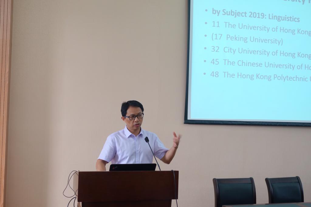本次会议分两个阶段进行。会议第一阶段由学院学术委员会主任王银泉教授主持。英语和日语两个二级学科点负责人裴正薇教授和李红教授分别就两个学科的建设发展作了汇报交流。李红教授就澳门正规官网日语学科的优势和劣势以及面临的问题和解决的途径作了详细的分析。裴正薇教授就英语学科硕士点的建设路径及发展前景进行了深入的分析和阐述。英语系主任李平教授结合香港高校语言类专业的发展现状作了专题交流,与大家分享了香港各高校英语学科建设现状与经验。