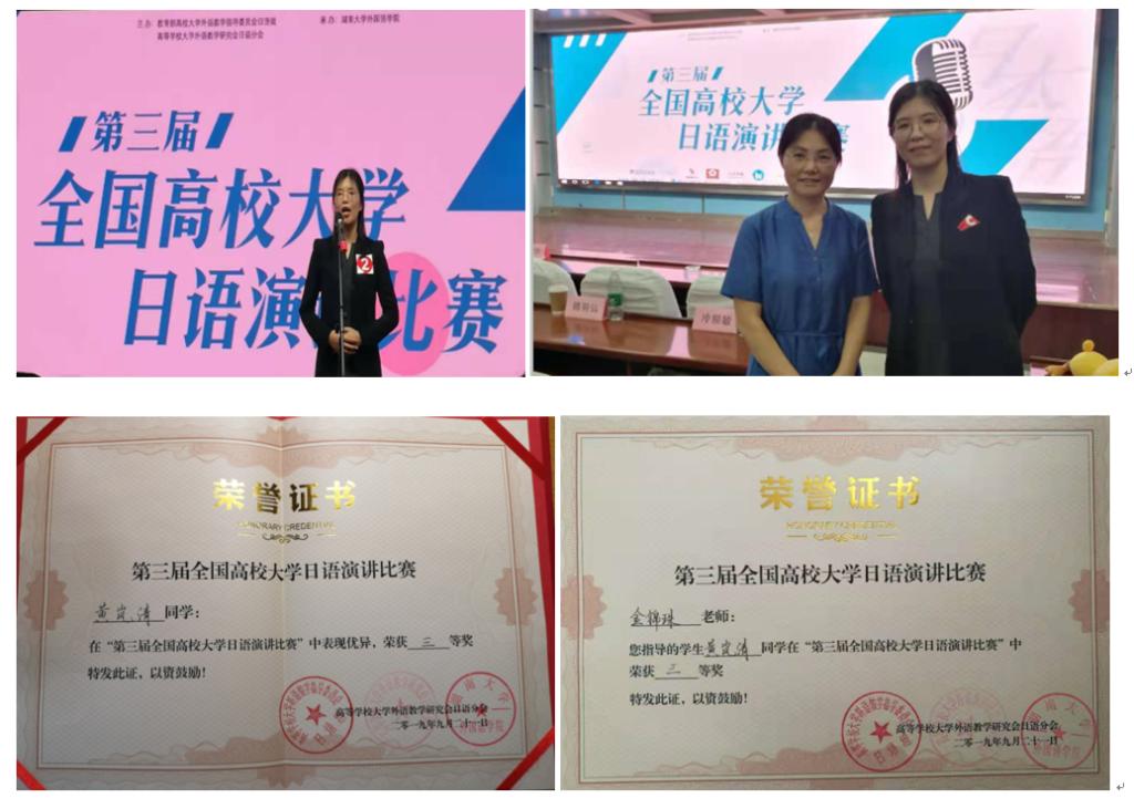 9月21日,第三届全国大学日语演讲比赛在湖南大学澳门正规电子游戏平台进行,南农大植物保护学院本科生黄岚清同学荣获三等奖,澳门正规电子游戏平台金锦珠获得优秀指导教师奖。来自全国高校的39名非日语专业学生参加角逐,比赛分为命题演讲和即兴演讲两个环节,选手们的出色表现受到评委的一致好评。