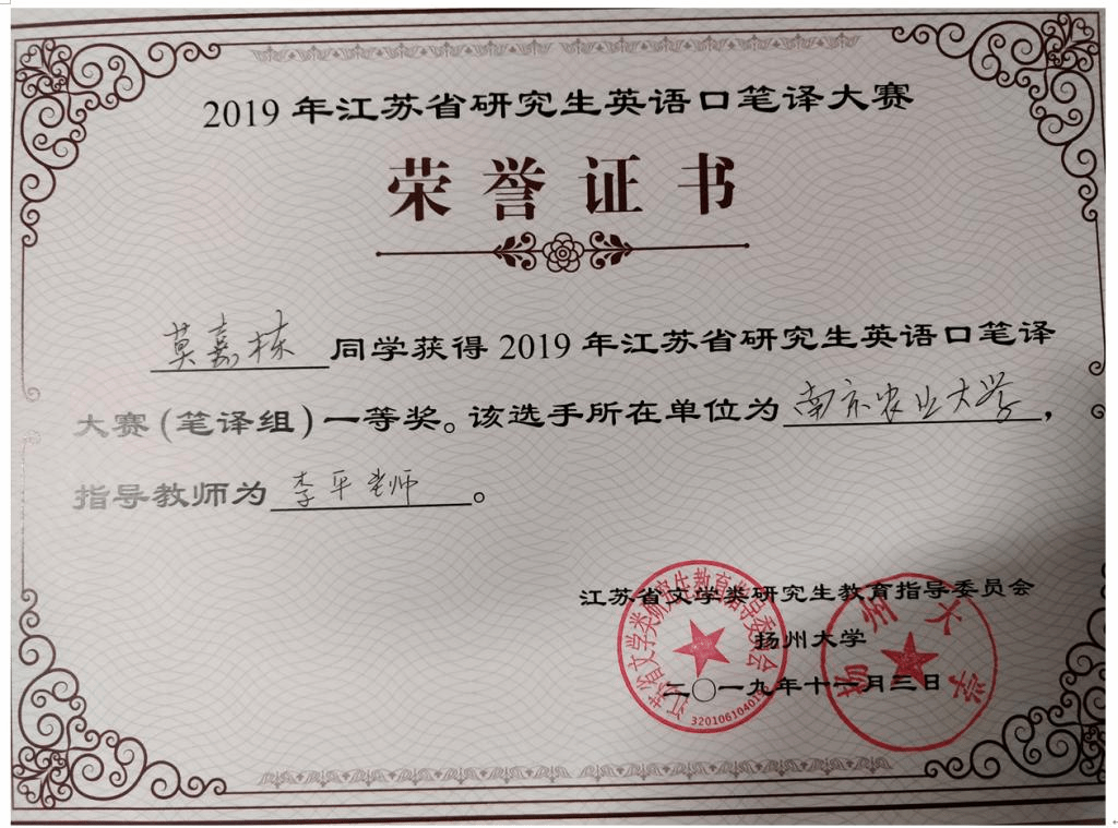 为在这次研究生翻译比拼中获得好成绩,澳门正规官网通过选拔,派出莫嘉栋、陈丹仪参加笔译赛事,邓玉萍、刘国豪参加口译赛事。赛前,李平老师、霍雨佳老师分别对四位同学进行了笔译和口译培训。通过现场角逐,四位同学不负众望,分别获得笔译一等奖、二等奖,口译三等奖、优胜奖,为澳门正规官网争得了荣誉。尤其是莫嘉栋同学,在笔译赛事中以总成绩第一名获得一等奖(总成绩=汉译英成绩*50% +英译汉成绩*50%)。
