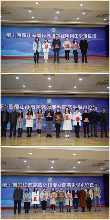 论坛期间,由江苏各高校近120人博硕士研究生代表分为翻译学、文学与文化、语言学三个方向、七个小组进行了论文汇报,共评选出了15篇优秀论文。此外,由各高校重点推荐46名博硕研究生分为翻译学、文学与文化、语言学三个方向、四个小组进行了大会发言,点评嘉宾进行了提问、建议和评审。论坛期间,共评选出优秀论文一等奖4名,二等奖8名,三等奖16名,优胜奖33名。