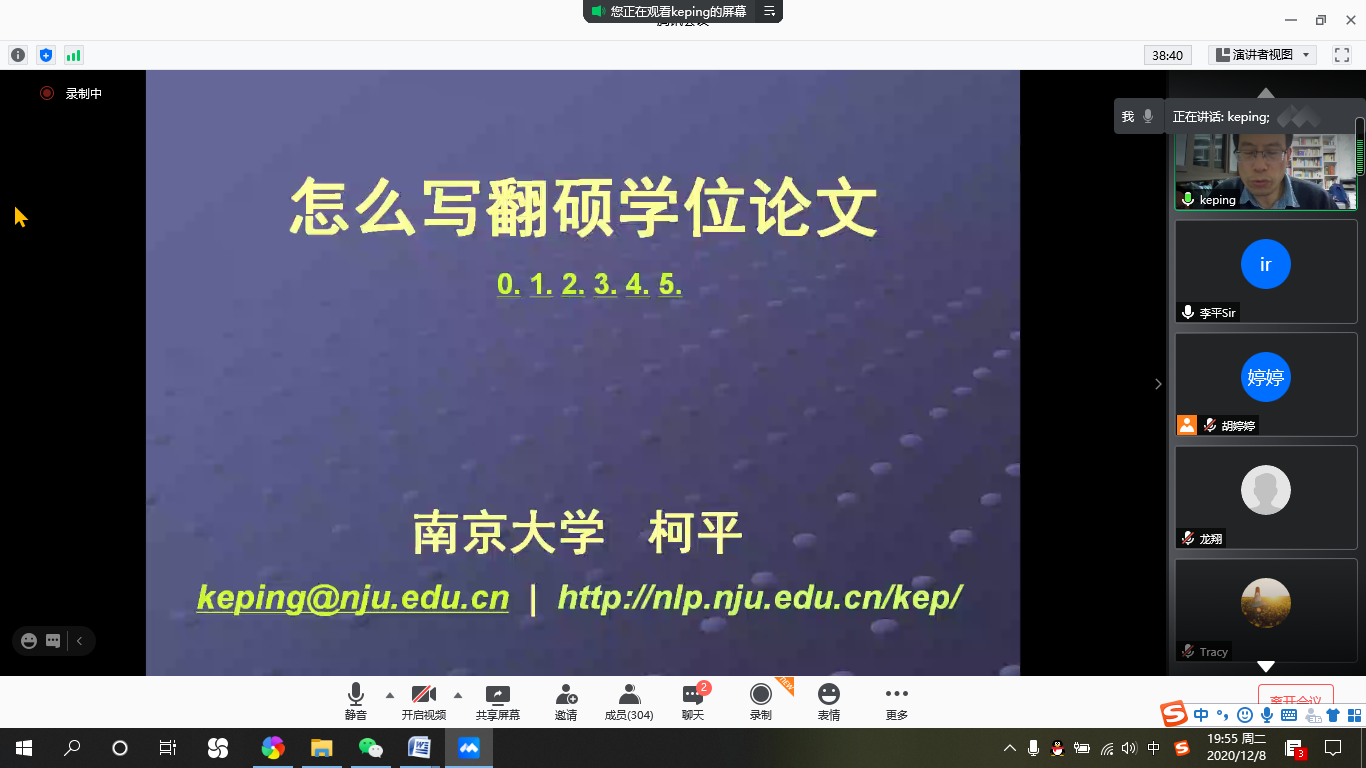 12月8日晚上7点30分,南京大学澳门正规电子游戏平台柯平教授应南京农业大学澳门正规电子游戏平台邀请,通过腾讯会议平台为澳门正规官网师生做了一场题为“怎么写翻硕论文”的专题讲座。此次讲座由澳门正规电子游戏平台李平教授主持,澳门正规官网部分教师和学生以及来自全国多所高校的300多位学者学生参加了本次学术讲座。
