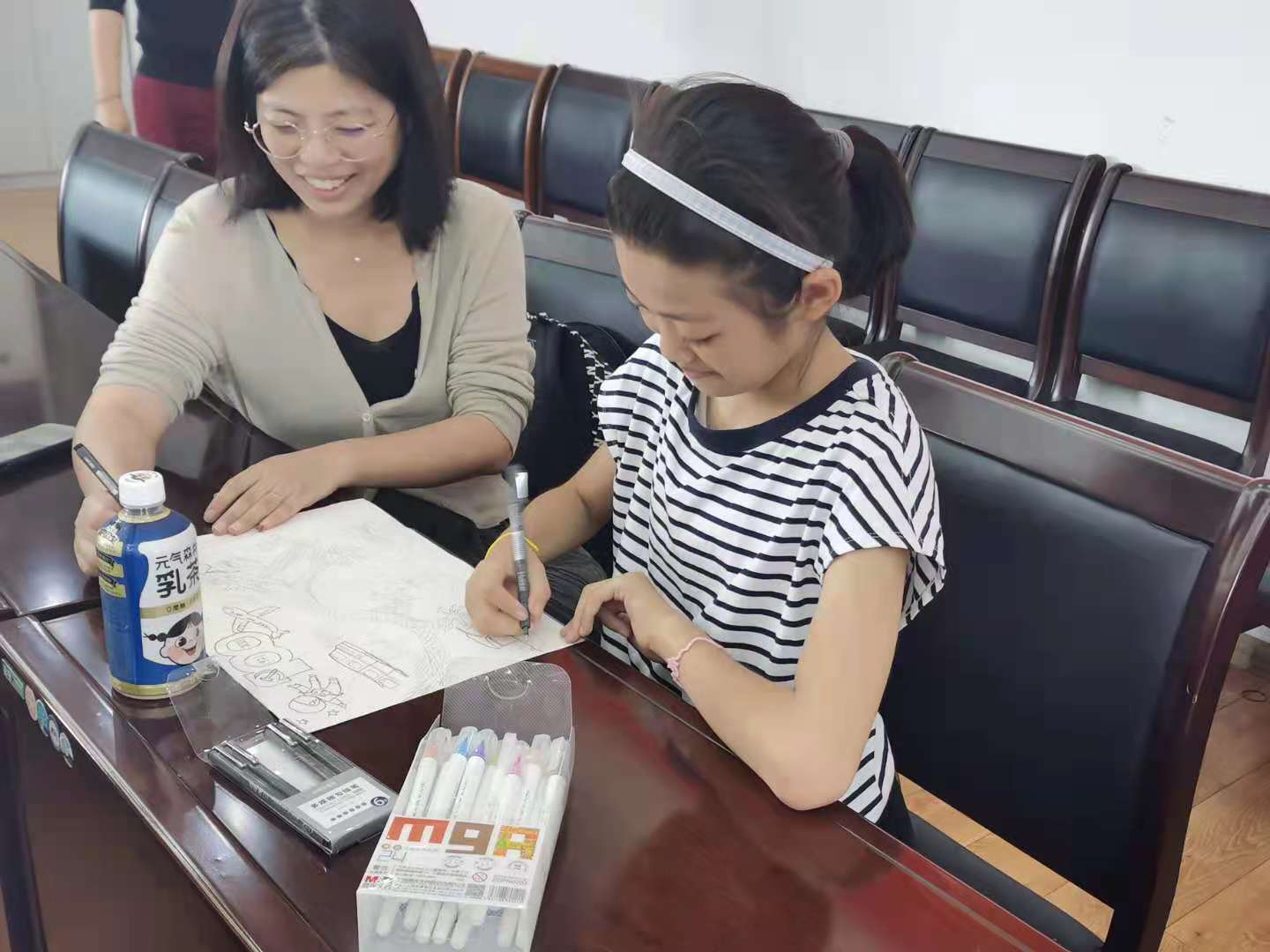 活动以亲子现场共同作画的形式展开,来自学院的教师和孩子们共同构思作画,现场气氛热烈。孩子们的作品构思精巧,充满想象力,用手中的画笔描绘出心中的美好家园和幸福生活。《南昌起义打响的第一枪》、《巨龙腾飞》、《不忘初心,牢记使命》、《鱼戏莲叶图》,一幅幅生动的画作诠释了不忘历史、国力昌盛、民族富强、人民幸福的场景,也寄予了老师和孩子们的美好愿望。
