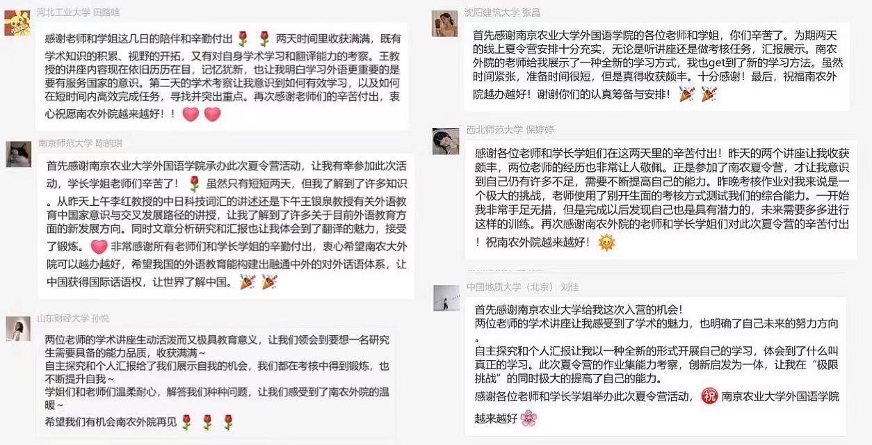本次夏令营活动组织有序,内容丰富,充分体现了学术性与实践性并重。来自各大高校的营员在微信群内纷纷留言,表示收获颇丰,从精彩的学术讲座中学到了知识,获得了启迪。学子们认识到作为外语人,不仅要习得语言技能,更要培养“世界眼光、中国情怀”,服务于国家和社会。不少营员表示此次考核方式别出心裁,用四个小时完成一篇译文及汇报,颇具挑战性。在迎难而上,认真准备的过程中,锻炼了自己高效学习与完成任务的能力,收获了新的学习方法与思路。