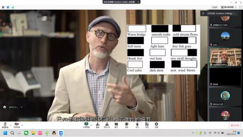10月23日至11月13日,美国俄克拉荷马大学石江山(Jonathan Stalling)教授应澳门正规官网邀请为校内外师生讲授题为“英语绝句写作研究”的系列讲座。讲座共分四场,于每周日上午采取线上方式在腾讯会议平台举行;累计参会人数为200余人次。讲座由澳门正规官网英语系副教授、本年度科技部外国专家项目“中国绝句英译工作坊”负责人丁夏林博士主持。