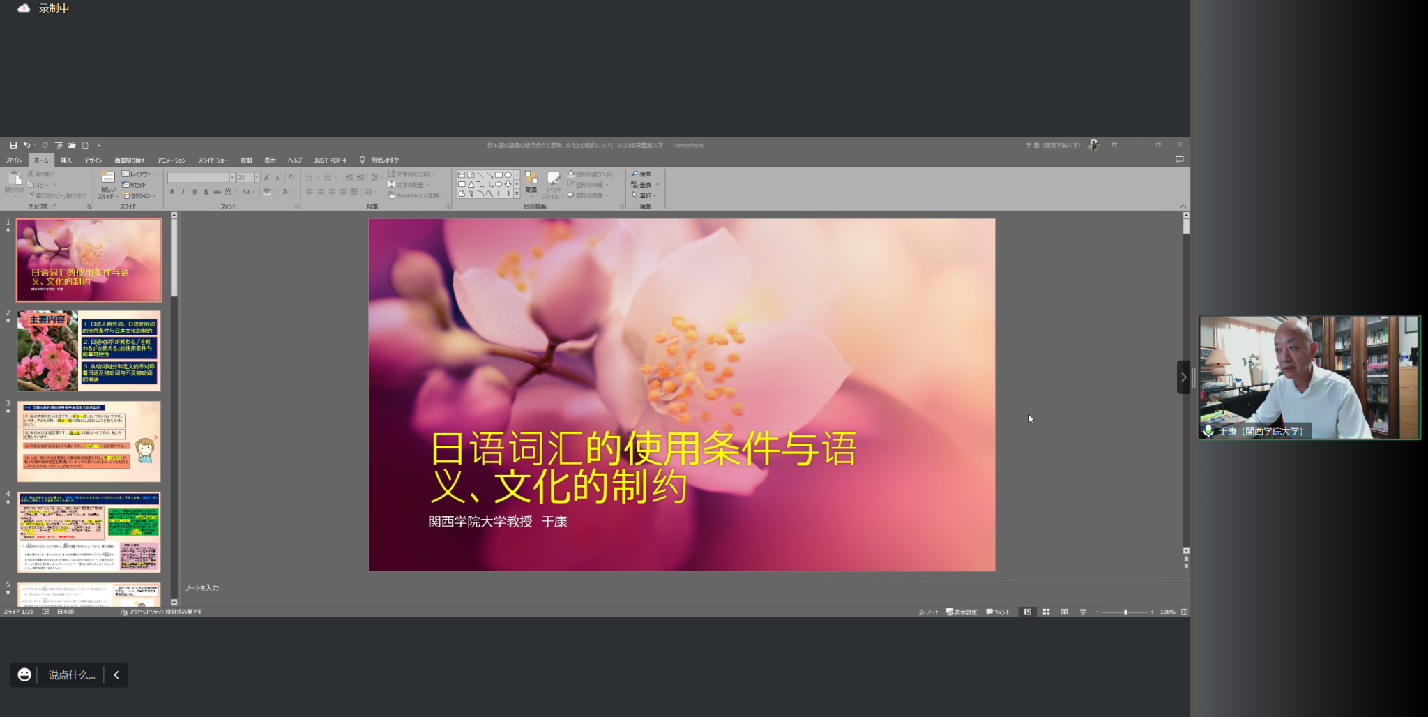 为加强学科建设,促进学术交流,澳门正规官网组织开展了2023中日语言文化交涉系列讲座。6月16日,日本关西学院大学于康教授应邀为澳门正规官网师生开展了题为《日语词汇的使用条件与语义、文化制约》的线上讲座。会议由澳门正规官网日语学科点负责人李红教授组织发起、教师陈海涛博士主持。来自全国各个院校师生共计60余人参加了此次讲座。