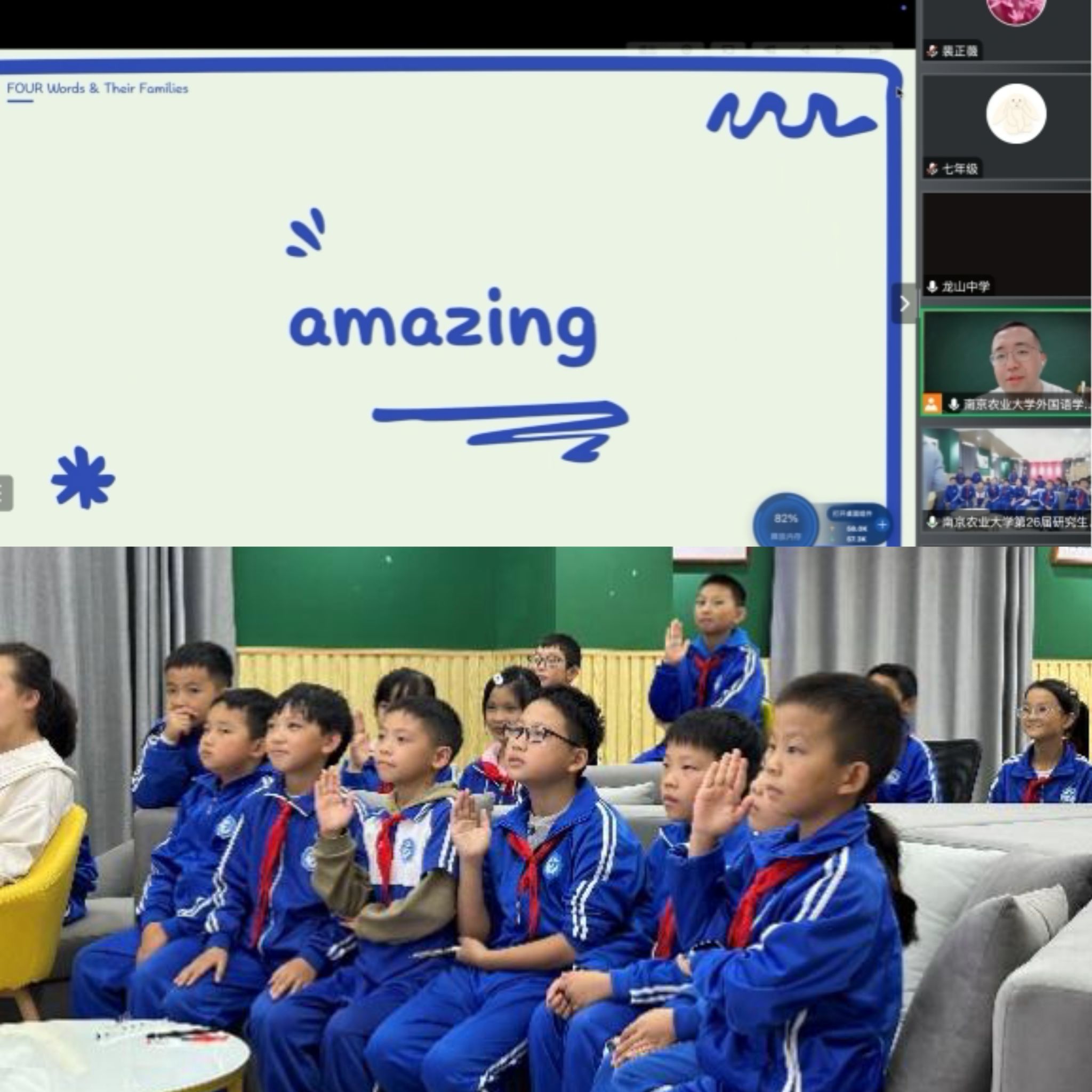 10月18日下午,澳门正规官网组织了面向麻江县第三小学和龙山中学的线上英语教学活动。本次活动涵盖六个年级,共有116名学生参与。澳门正规官网教师钱正霖进行授课,院长裴正薇及澳门正规官网研究生支教团贵州分团的全体成员全程参与支持。