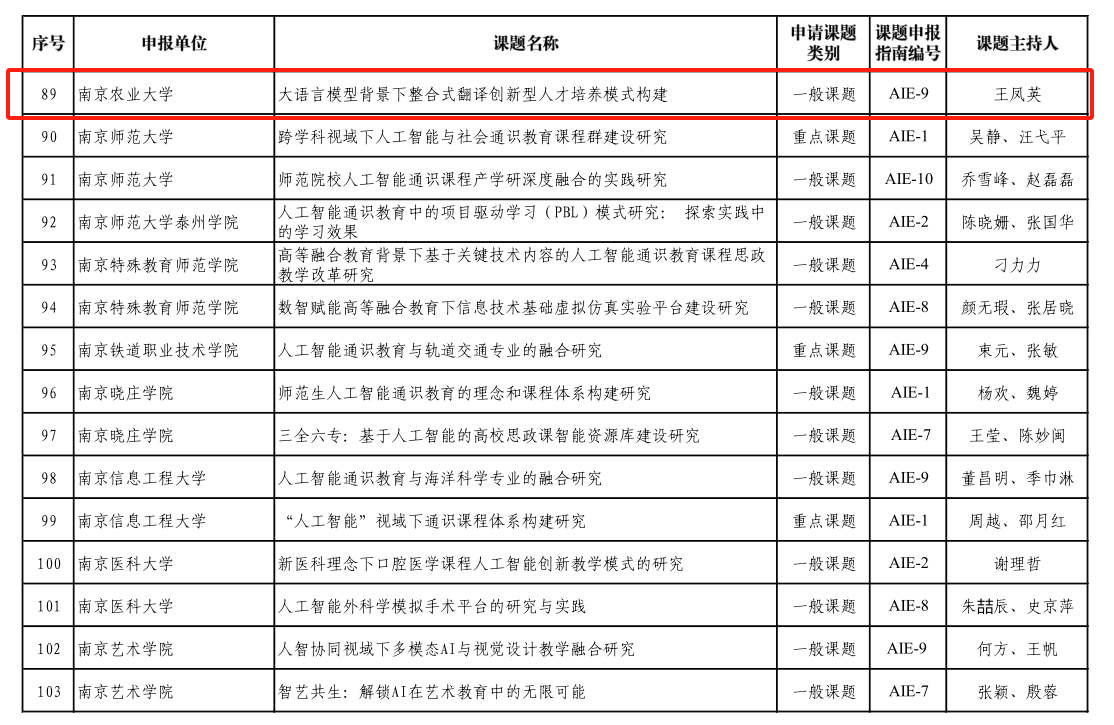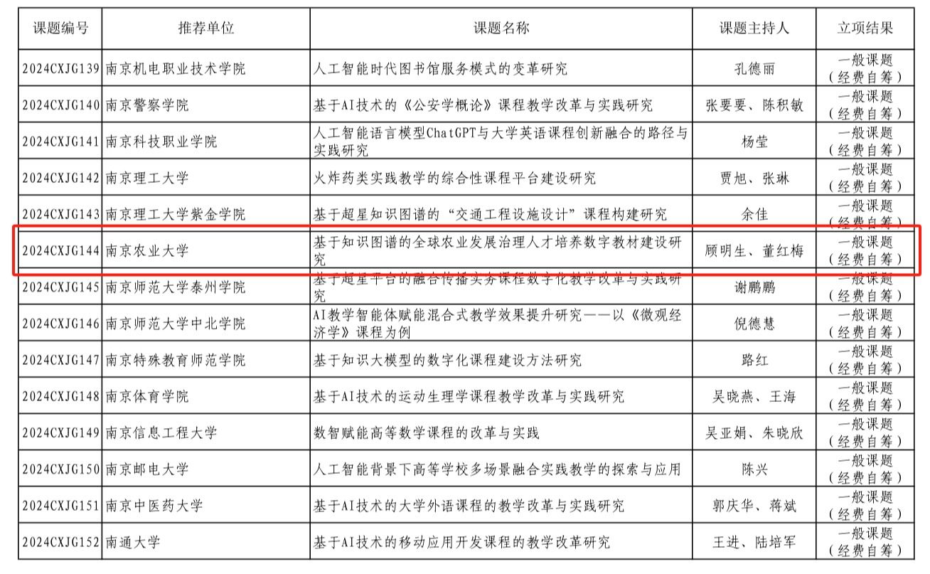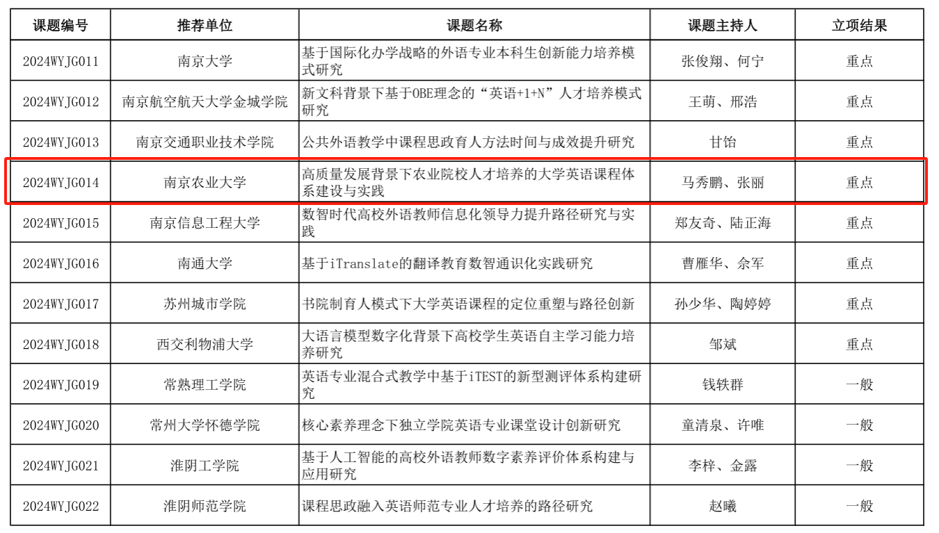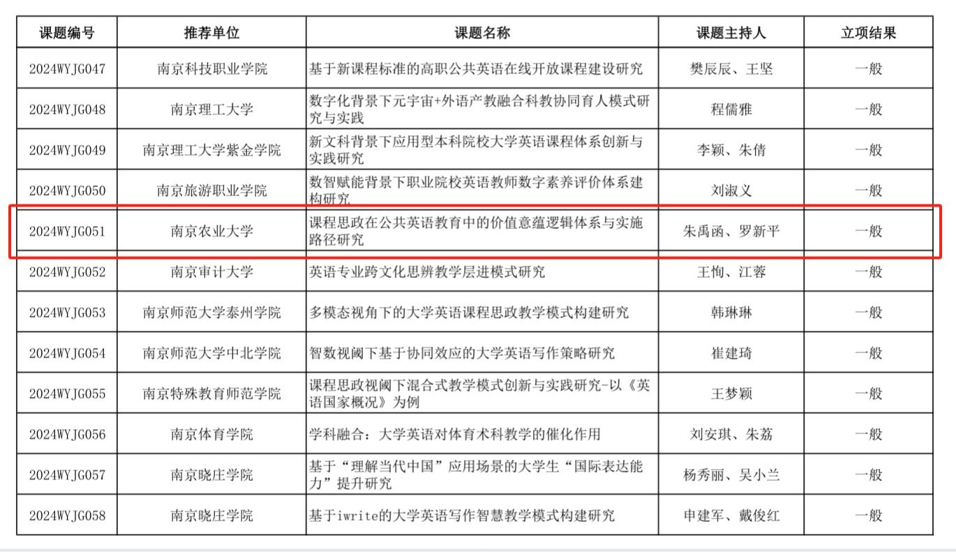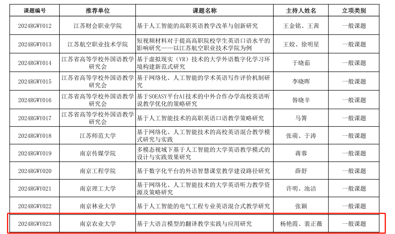 在此次获批课题中,杨艳霞、裴正薇团队的《基于大语言模型的翻译教学实践与应用研究》紧扣外语教学与前沿科技的融合趋势,获批2024年江苏省高校“基于人工智能的大学外语数字化创新教学”专项课题。马秀鹏、张丽团队的《高质量发展背景下农业院校人才培养的大学英语课程体系建设与实践》以及朱禹函、罗新平团队的《课程思政在公共英语教育中的价值意蕴逻辑体系与实施路径研究》聚焦农业院校外语教学体系的优化与思政教育的深度融入,积极探索外语教育服务农业人才国际化培养的新模式,分别获批2024年江苏高校外语教育“高质量发展背景下外语教学改革”专项课题的重点课题和一般课题。顾明生、董红梅团队申报的《基于知识图谱的全球农业发展治理人才培养数字教材建设研究》获批江苏省“高等教育数字化转型与教育现代化实践研究”专项课题,为全球农业发展治理相关外语人才的培养提供数字化资源支撑。王凤英团队的《大语言模型背景下整合式翻译创新型人才培养模式构建》课题获批“江苏省高校人工智能通识教育教学改革研究专项课题”,着力于培养适应人工智能时代需求的翻译创新人才。