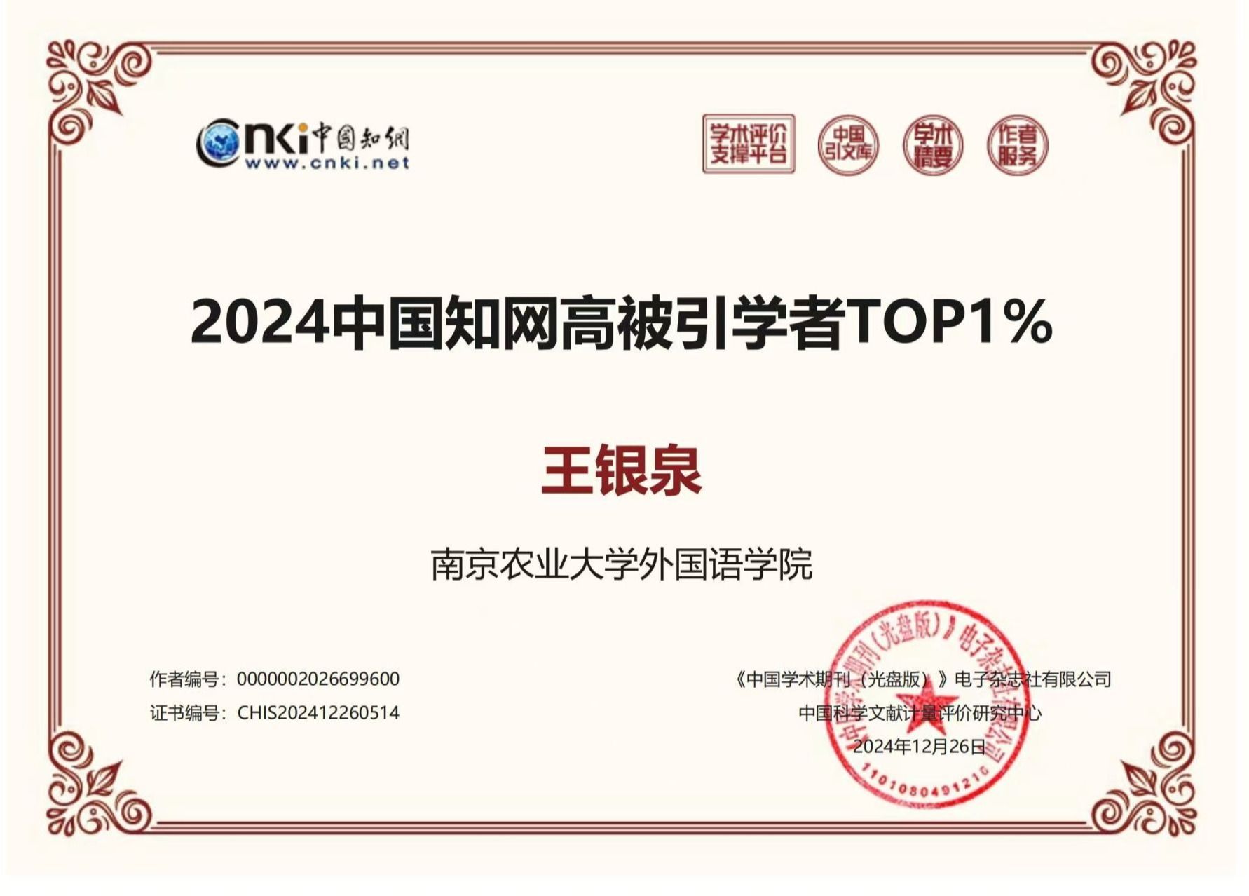 近日,中国知网遴选并公布了“2024中国知网高被引学者”名单,南京农业大学澳门正规电子游戏平台王银泉教授入选“2024中国知网高被引学者TOP1%”。