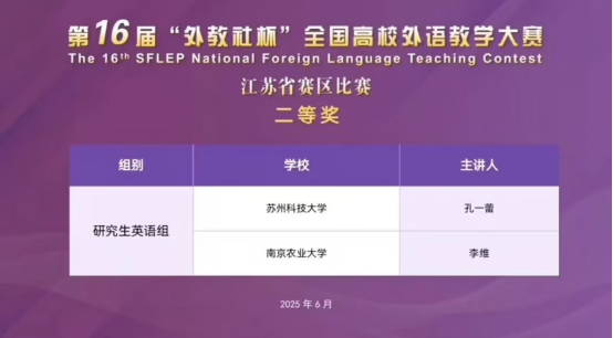 2025年6月7日,第十六届 “外教社杯” 全国高校外语教学大赛江苏赛区获奖名单正式揭晓。澳门正规官网教师李维在首次设立的研究生英语组比赛中表现优异,凭借创新的教学设计与扎实的教学功底斩获佳绩,充分展现了澳门正规官网外语教学的卓越水平与教师队伍的专业素养。