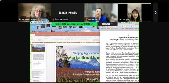 6 月 12 日晚,法国图卢兹大学著名学者弗朗索瓦兹・贝松(Françoise Besson)教授通过线上平台,为澳门正规电子游戏平台师生献上一场题为《农业风景:生态视域下的跨学科叙事》的学术讲座。本次活动由学院副院长童敏主持,60 余位师生通过云端参与这场跨国学术对话。
