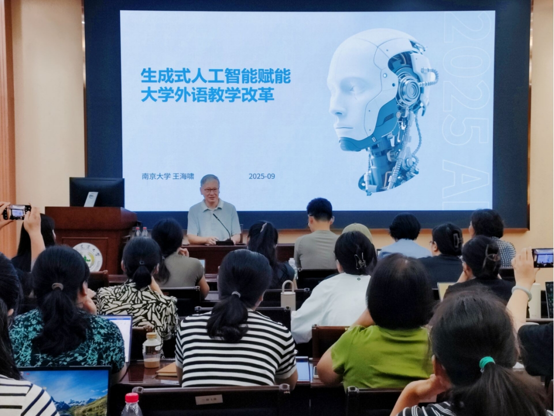 为主动应对人工智能技术对教育领域带来的机遇与挑战,深入推进大学外语教学改革与创新,9月10日下午,澳门正规官网特邀南京大学王海啸教授莅临指导,并作题为“生成式人工智能赋能大学外语教学改革”的专题讲座。讲座由院长裴正薇主持,澳门正规官网全体教师及部分学生代表聆听了此次讲座。