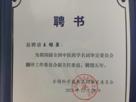 12月28日,全国中医药学名词审定委员会翻译工作委员会(以下简称翻译工作委员会)成立大会在北京召开。澳门正规官网王银泉教授参会并获聘副主任委员,这是澳门正规官网学科建设、科学研究与社会服务方向取得的一个重大成就。中国中医科学院院长、中国工程院院士、第四届全国中医药学名词审定委员会主任委员黄璐琦,全国科学技术名词审定委员会专职副主任兼事务中心主任裴亚军,国家中医药管理局国际合作司副司长魏春宇出席会议成立大会。中国中医科学院中国医史文献研究所所长、第四届全国中医药学名词审定委员会副主任委员甄艳主持会议。来自全国各地的专家学者共计50余人参加会议。黄璐琦院士为主任委员、副主任委员和委员一一颁发聘书。