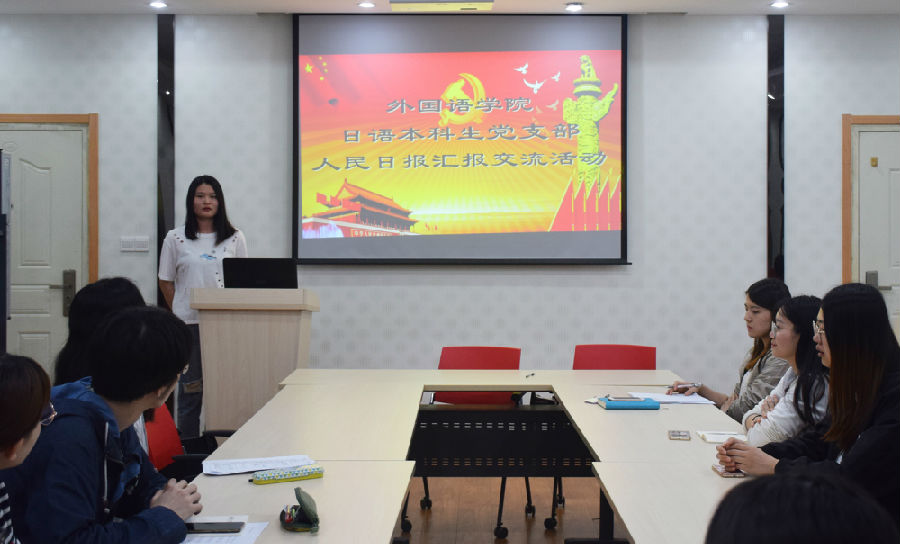 5月11日晚,澳门正规官网日语本科生党支部《人民日报》学习汇报交流活动在教学楼A310举行。支部书记贾琼及支部全体党员参加,活动由贾琼主持。