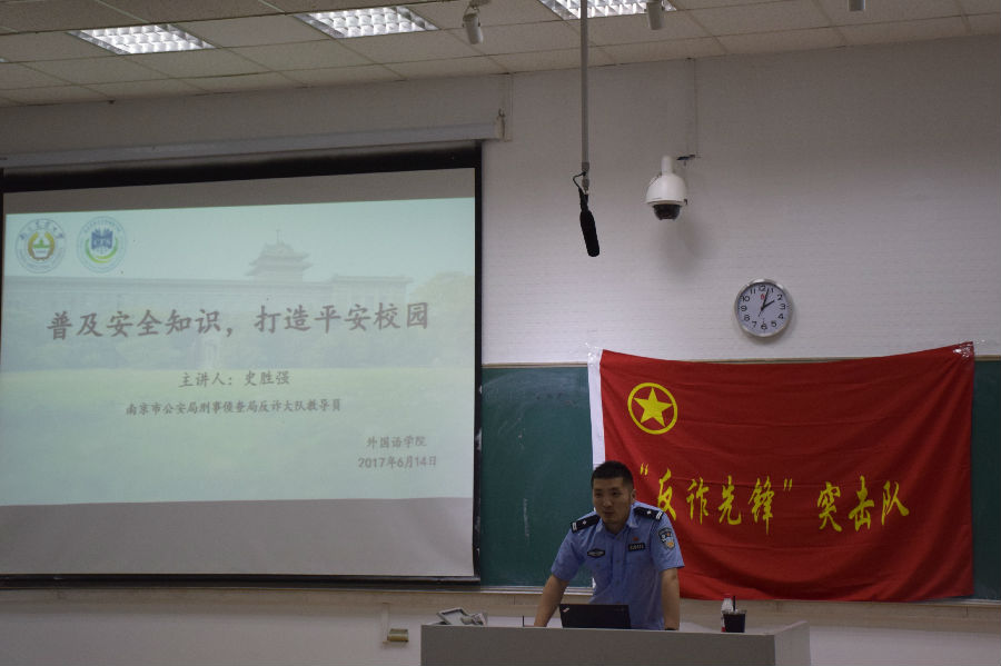 2017年6月14日下午,澳门正规电子游戏平台“普及安全知识,打造平安校园”安全知识普及讲座在教学楼C201开展。本次讲座邀请南京市公安局刑事侦查局反诈大队史胜强教导员做主讲人,澳门正规官网党委副书记董红梅、辅导员贾琼、全体大一学生以及部分学生代表参加了本次讲座。