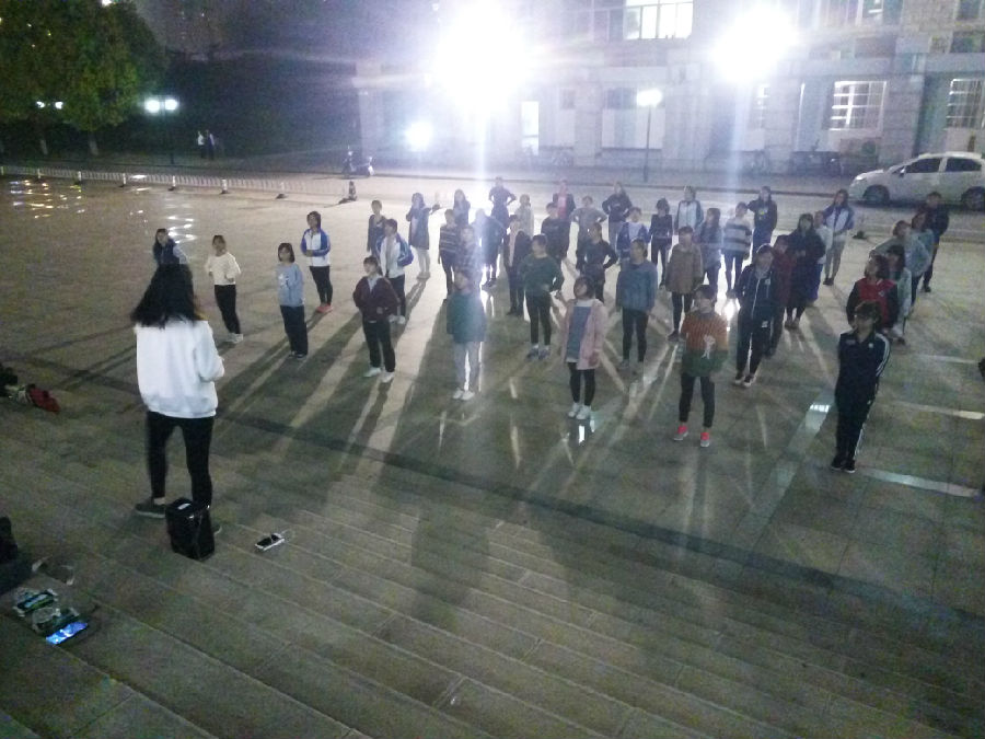 4月13日晚8点45分,50多位啦啦操队员与教练、负责人及辅导员们在逸夫楼广场前集合,开始了第一次训练。逸夫楼广场明亮的路灯下,队员们在教练的带领下拉腿、劈叉,活动身体。啦啦操队员们都积极训练,兴致勃勃地学习。而在另一边,在逸夫楼的台阶上,两位辅导员也在教练的带领下做起了热身。