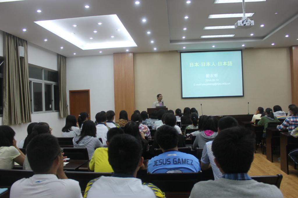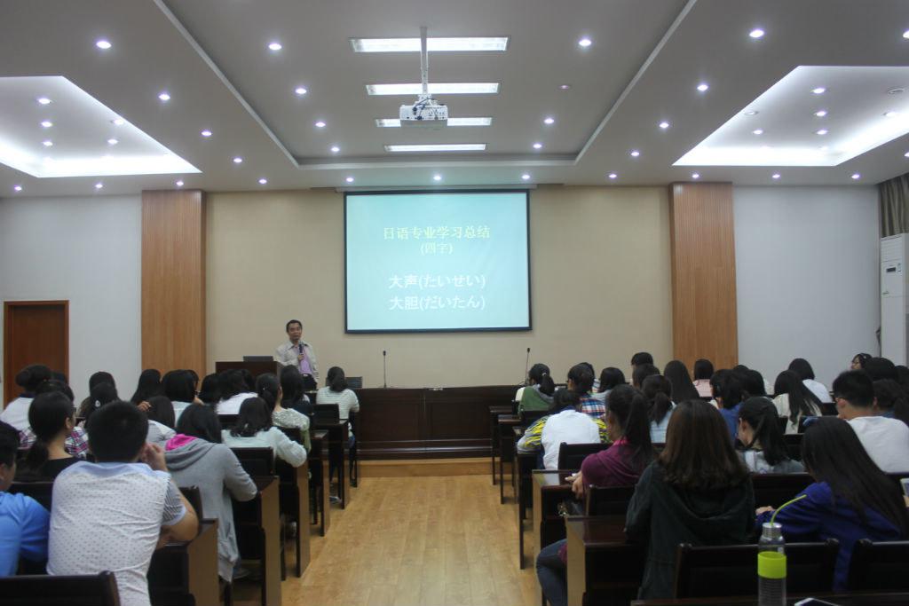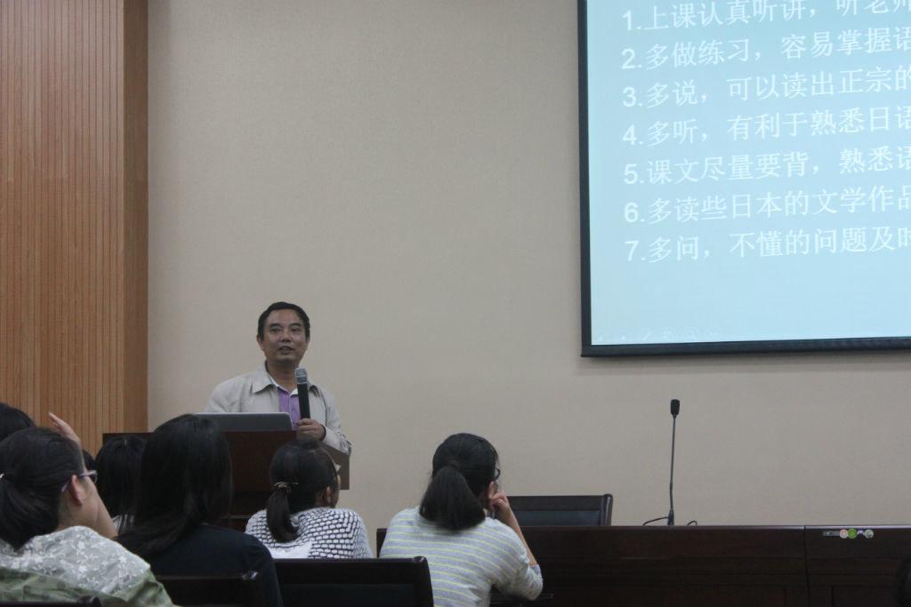 首先,游院长简单介绍了日本大致的地理位置以及行政区划。重点展示了他在日期间拍摄的一些照片并回忆了自己的一些经历与活动,透过这些照片以及游院长生动地描述,新生们领略了日本的美景,欣赏了日本特色建筑,感受了日本的饮食文化、民风民俗。接着游院长从“自然观”,“危机感”,“集团归属意识”,“等级序列与能力平等主义”,“守礼之邦”等方面,以《菊与刀》为例向新生们展示了复杂甚至矛盾的日本国民特性,“生性极其好斗而又非常温和;黩武而又爱美;倨傲自尊而又彬彬有礼;顽梗不化而又柔弱善变;驯服而又不愿受人摆布;忠贞而又易于叛变;勇敢而又懦怯;保守而又十分欢迎新的生活方式”。随后游院长简略地介绍了日本語言,告诉大家日本语是一种“入门易深入难”的语言。最后游院长讲到了日語学習,重点提到“语言学习是为了交流”,并就此给出了学好日语的方法,即“大声”,“大胆”。要求新生们“多加练习”,“不耻下问”,这样才能有机会真正学好甚至掌握日语。
