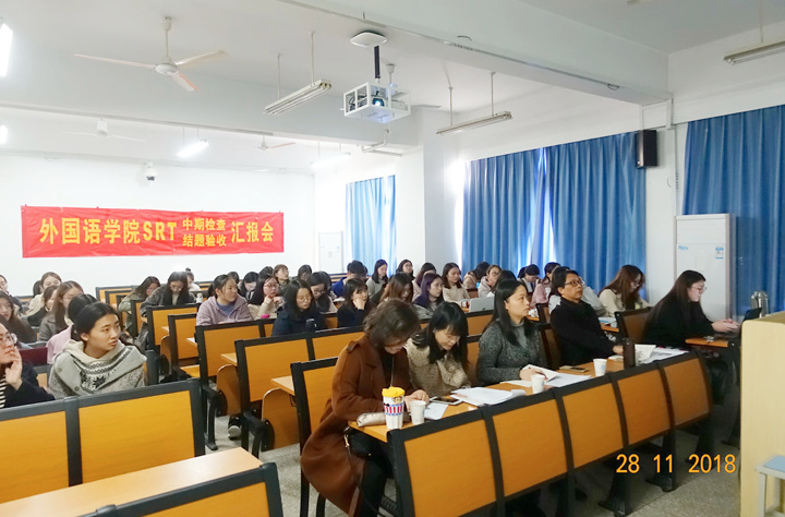 2018年11月28日下午,澳门正规电子游戏平台在教学楼A525和A528举行了SRT项目中期检查的汇报会。汇报分成英语组和日语组同时进行。英语组由李平、裴正薇、樊淑英以及张萍四位老师担任评委,日语组则由卢冬丽、金锦珠、武锐以及王薇四位老师担任评委。每位评委老师都对各个项目组的展示内容提出了自己建议,并对后续研究的开展表现了期待。